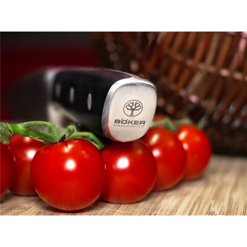 Die Kochmesser-Serie Böker Forge verbindet innovative und dynamische Formgebung mit klassischer Materialauswahl in Premiumqualität. Auffallend ist die attraktive Linienführung, die die Messer deutlich von der Masse der herkömmlichen Küchenmesser abhebt, ohne zu exzentrisch zu wirken. Darüber hinaus überzeugt die Serie Böker Forge mit einem ausgesprochen attraktiven Preis-Leistungs-Verhältnis. Die aus dem Chrom-Molybdän-Vanadium Edelstahl X50CrMoV15 gefertigten Messer sind optimal ausbalanciert und liegen durch die ergonomische Griffgestaltung perfekt in der Hand. Schwarze Griffschalen aus hochwertigem Spezialkunststoff werden klassisch mit drei Edelstahlnieten dauerhaft und ohne Fugen mit dem vollständig durchgehendem Messererl verbunden. Die Gestaltung der Klingen samt Übergang zum Kropf erlaubt ein problemloses Nachschärfen und gewährleistet in Kombination mit der richtigen Pflege eine langfristig perfekte Funktion der Messer. Bitte reinigen Sie die Messer nur per Handwäsche und nicht in der Spülmaschine. Darüber hinaus überzeugt die Serie Böker Forge mit einem ausgesprochen attraktiven Preis-Leistungs-Verhältnis. Die Auslieferung der Messer erfolgt in einer hochwertigen Geschenkverpackung.