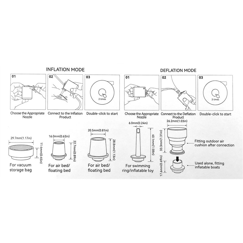 Zusammen mit einem vielseitigen Set aus fünf Düsen passt unsere kleine Luftpumpe zu verschiedenen aufblasbaren Gegenständen, von Luftmatratzen bis hin zu Poolspielzeug, und gewährleistet die Kompatibilität mit Luftbetten, Matten, Schwimmhilfen und vielem mehr. Die tragbare Luftpumpe ist die perfekte Ergänzung für Outdoor-Abenteuer wie Camping, Wandern oder Strandtage.