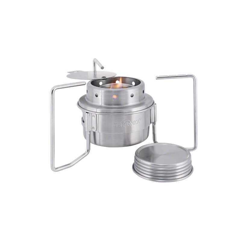 Spirituskocher, bestehend aus dem kompakten Brenner, einer Flammen-Einstellvorrichtung (Flame Adjuster), die in den Kocher integriert werden kann, und einem vierteiligen Standfuß.